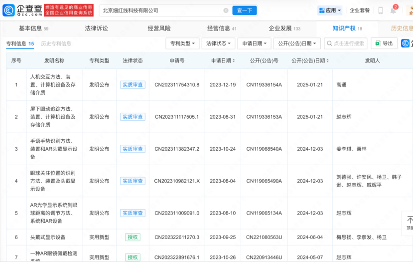 企查查信息显示,细红线的专利申请停留在2023年12月,而2024年前后,正是罗永浩转头做AI的时候,且已公开的专利中几乎未见AI软件相关专利。