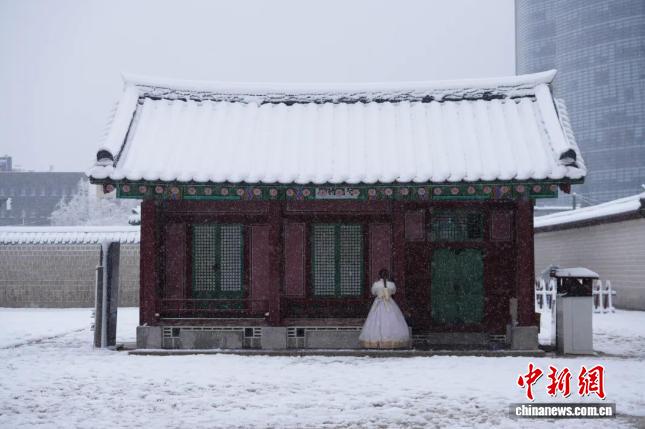 当地时间2024年11月27日,游客在首尔景福宫欣赏雪景。中新社记者 刘旭 摄