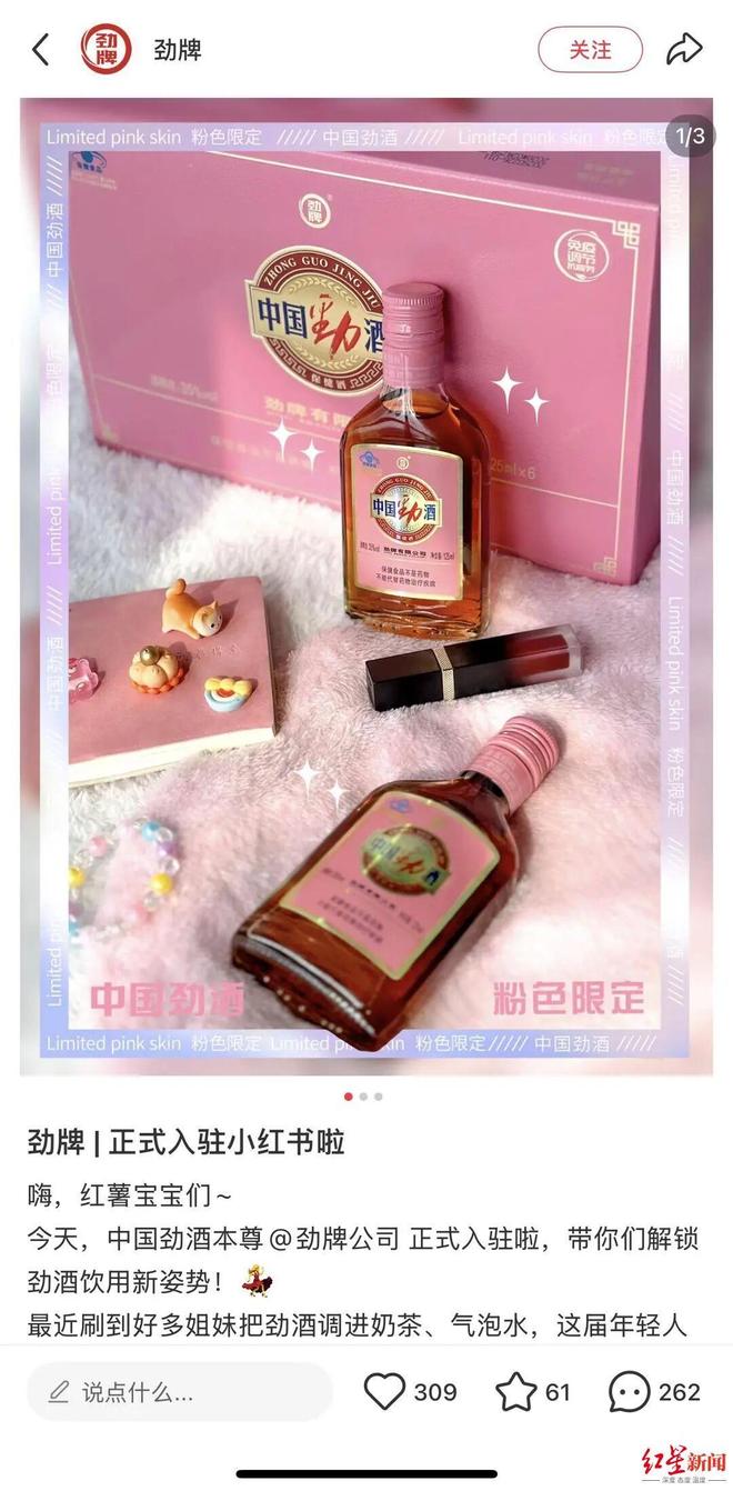 2023年底,有女性用户在小红书分享喝劲酒缓解痛经的帖子,将其称为“姨妈神仙水”。劲酒作为保健酒,加入的黄芪、枸杞子、肉桂、当归等保健成分,有抗疲劳、免疫调节等功效。