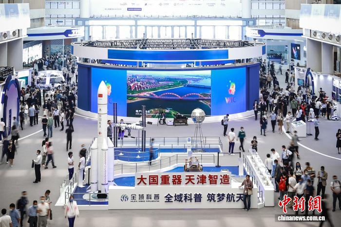 2021年5月20日,以“智能新时代:赋能新发展、智构新格局”为主题的第五届世界智能大会在天津开幕 。本届大会采用全新办会模式,通过“会展赛+智能体验”四位一体的方式精彩呈现,为世界智能科技领域搭建起交流合作、共赢共享的平台。图为中国航天科技集团展位引关注。 记者 佟郁 摄